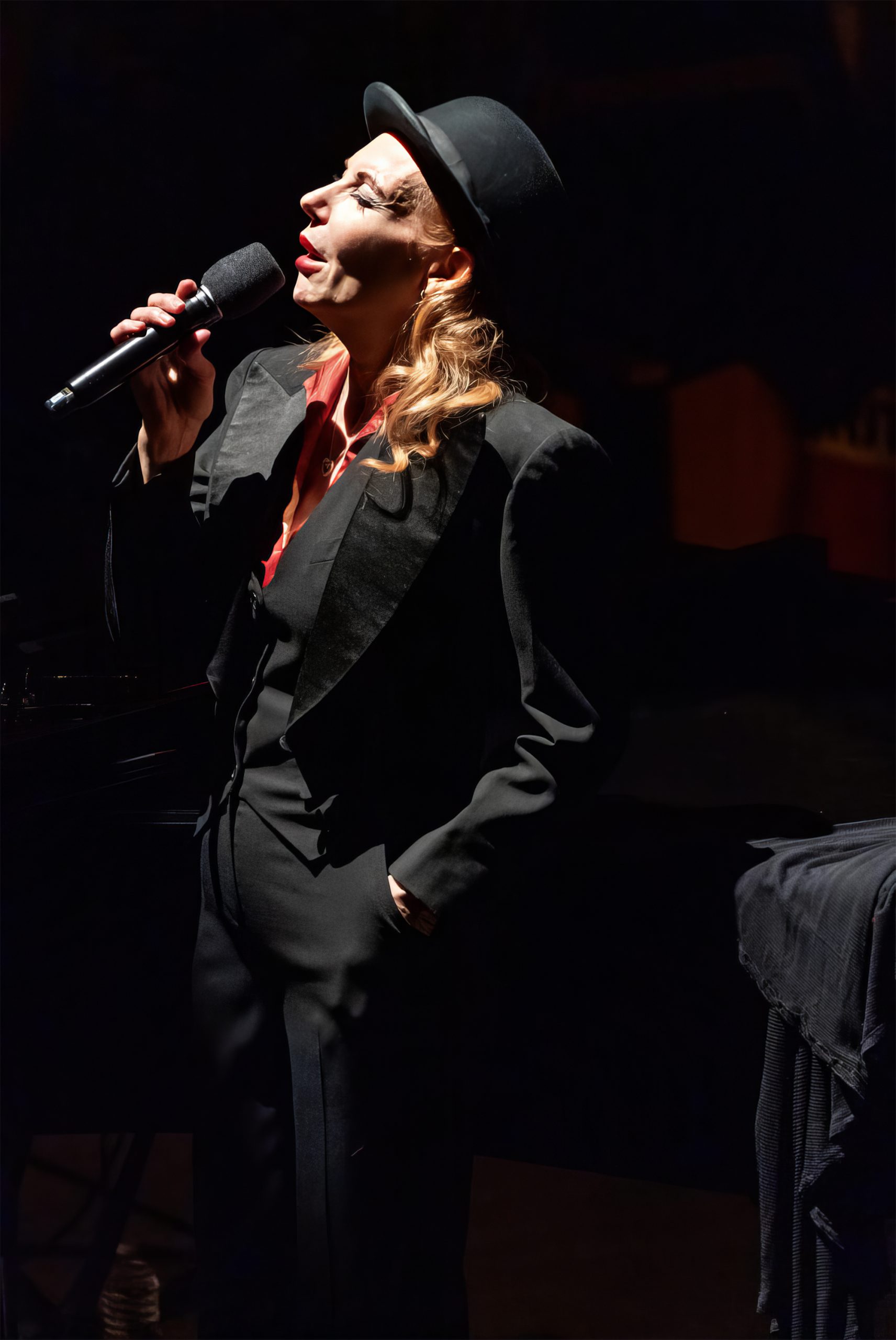 Throughout the performance, the fair-haired chanteuse changed costume from drab street musician attire, to black gown, jumpsuit, sexy red evening attire and ending with a long black somber covering jacket all while remaining on the stage – unbelievably peeling off one outfit after another. Her physical transformation was like that of a chameleon adapting to its environment – each time clad in clothing that represented the ensuing change of political and hence cultural attitude. From her appearance, we saw the Weimar Republic begin its rise from the ashes of the horrors of World War I, peak in cultural and societal openness and then just as swiftly crumbled due to the destruction of the country’s democratic government.